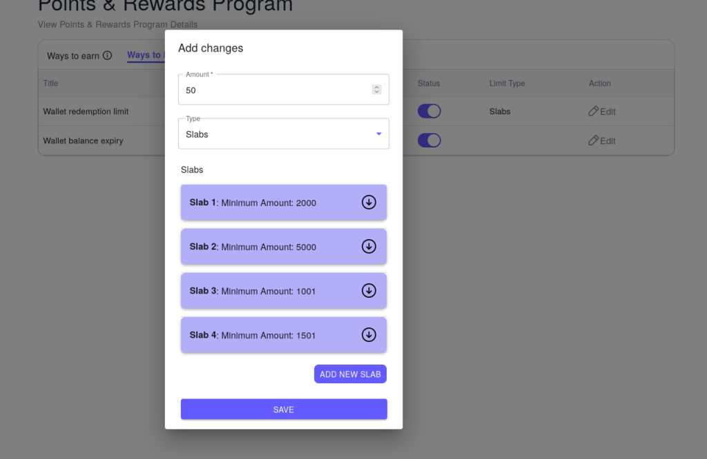 Slabs let you set up spending-based reward tiers, automatically applying discounts and wallet rewards based on how much a customer spends.